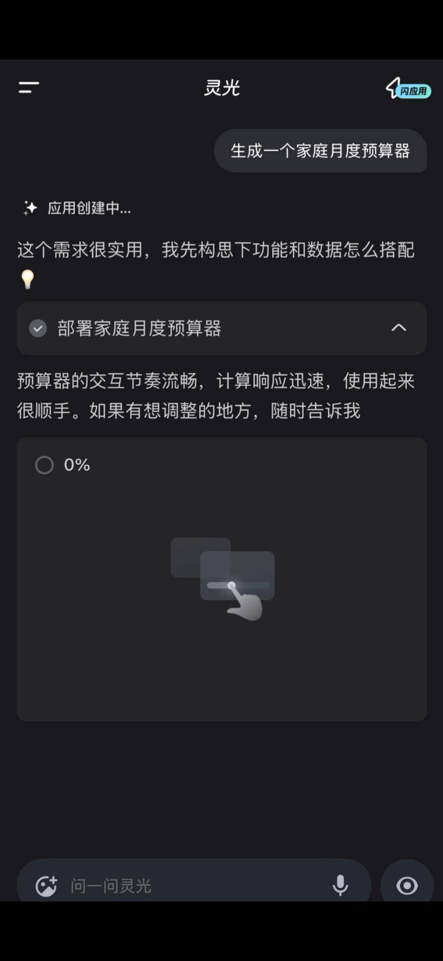 以“家庭预算管理”为例:传统AI助手在接收到“如何做家庭预算”的提问时,通常会生成数千字的文字建议,用户仍需手动整理和执行;而蚂蚁灵光则直接生成一个功能完整的“家庭月度预算器”闪应用——用户可实时录入收入、支出数据,系统自动计算结余、生成可视化图表。这种从“交付信息”到“交付工具”的转变,实现了“需求-工具-解决问题”的闭环,让AI从“陪聊”升级为“陪干”。