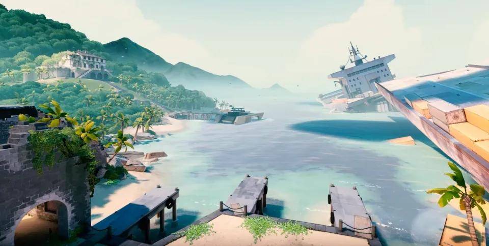 除了角色设计,游戏中的地图同样凝聚了设计师们的心血。为了竞技性考虑,“瓦手”地图的主体部分必须保持简洁,但那些不可互动的部分则成为了设计师展示才华的舞台。微风岛屿中阳光穿过棕榈叶的海岛风光、亚海悬城中整座城市漂浮在空中的视觉奇景、霓虹町高低错落的城市设计,都在游戏中得到了恰如其分的呈现。