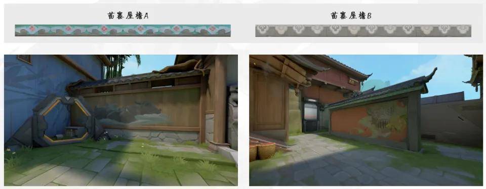 为了保持色调的一致性,不让地图元素干扰正常的游戏进程,设计师还对取材地的屋檐样式进行了化用,舍弃了看起来突兀的白色,选用了与地图整体风格契合度较高的绿色。