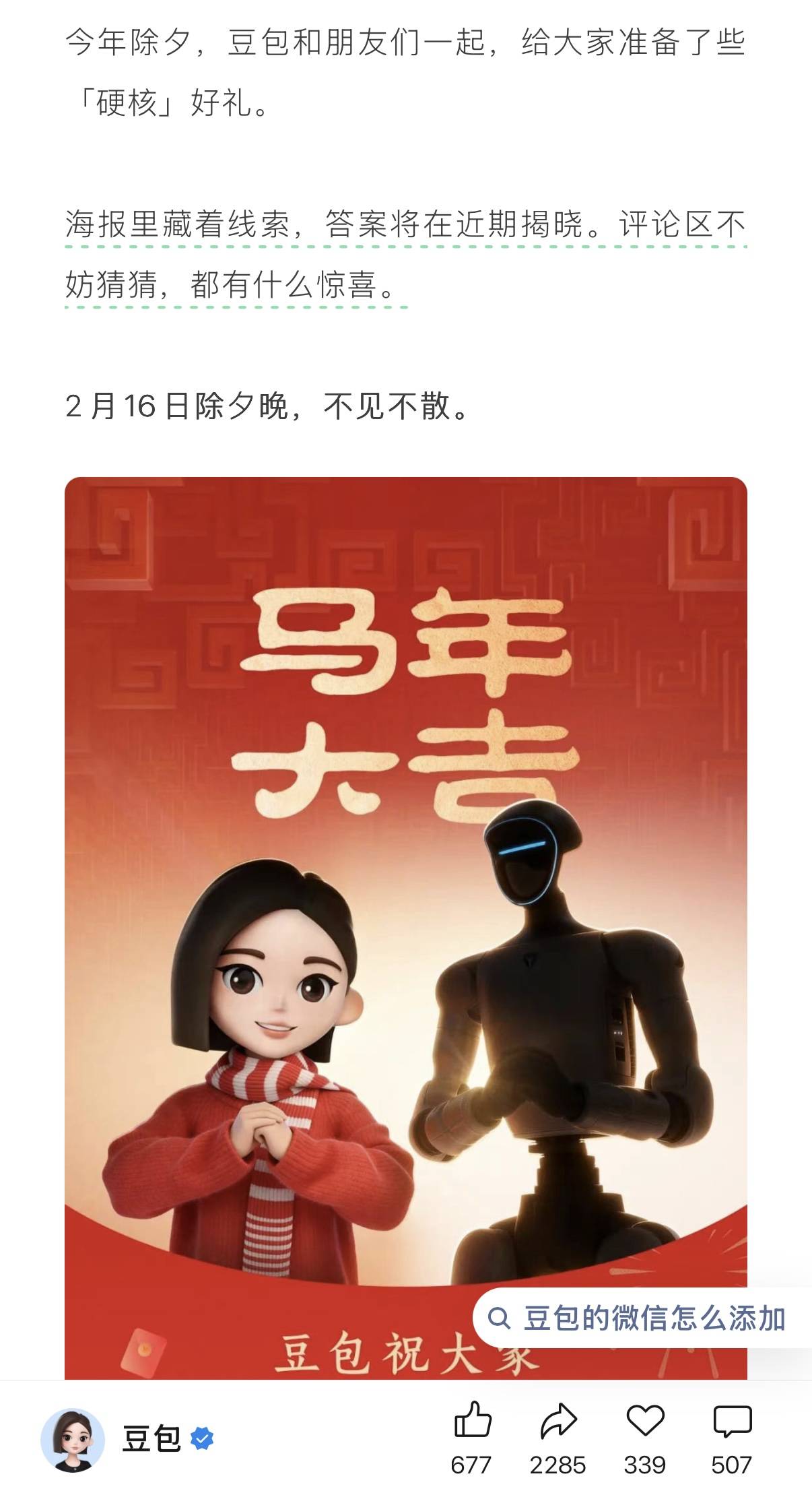 时代财经注意到,2月5日,豆包官方账号发布一则公告,称今年除夕给大家准备了些硬核好礼,并表示已将福利线索藏于配套海报之中。海报中清晰出现了人形机器人、汽车、无人机等元素,引发网友广泛猜测。此前,字节跳动已正式官宣,旗下火山引擎成为“2026年春晚独家AI云合作伙伴”,旗下AI产品“豆包”也将配合上线多种互动玩法。