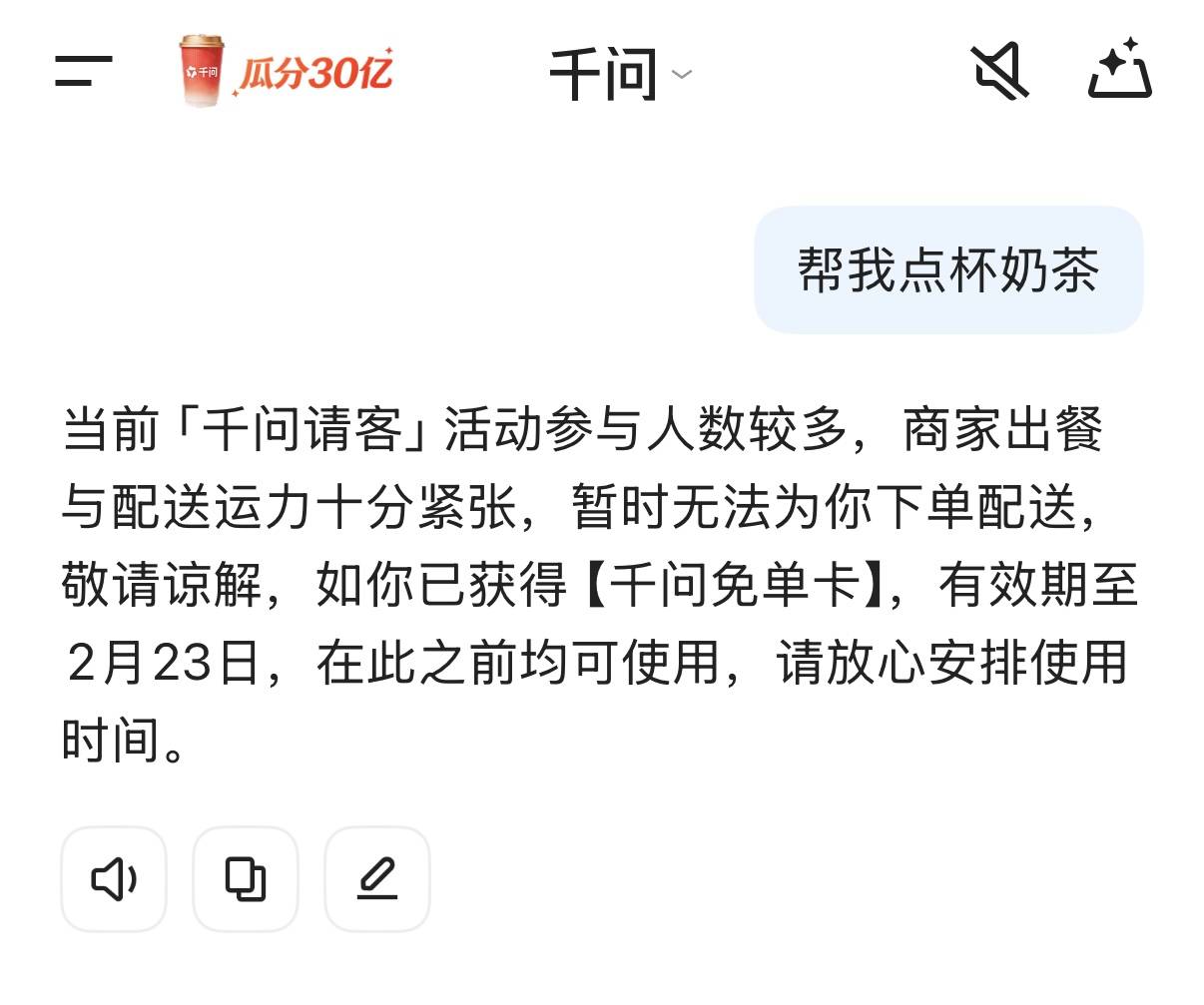 这种免单力度成效立竿见影。社交平台上,千问免单活动迅速掀起讨论热潮,网友纷纷晒出自己的免单订单。由于订单激增,不少奶茶店甚至选择临时闭店,状态显示为“店铺已休息”。 截至发稿,时代财经实测点单时,仍收到千问App提醒:活动参与人数较多,商家出餐与配送运力十分紧张,暂时无法下单配送。