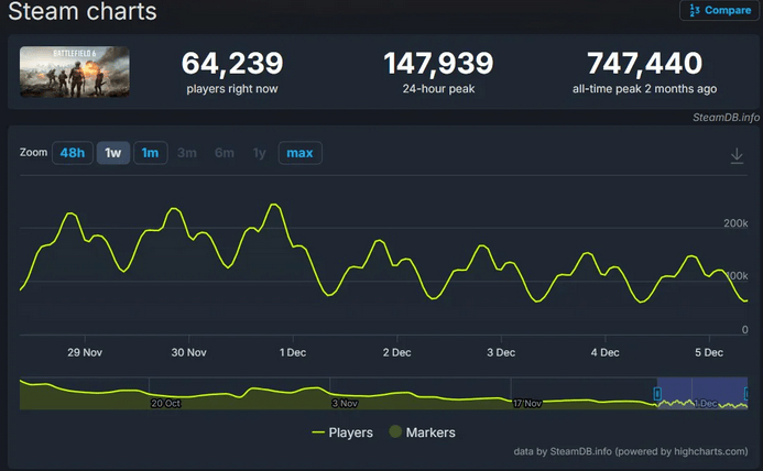 然而,仅两个月后,《战地6》的峰值玩家数量已骤降近80%,当前活跃玩家甚至低于《三角洲行动》、《燕云十六声》及《Rust》等同期热门游戏。